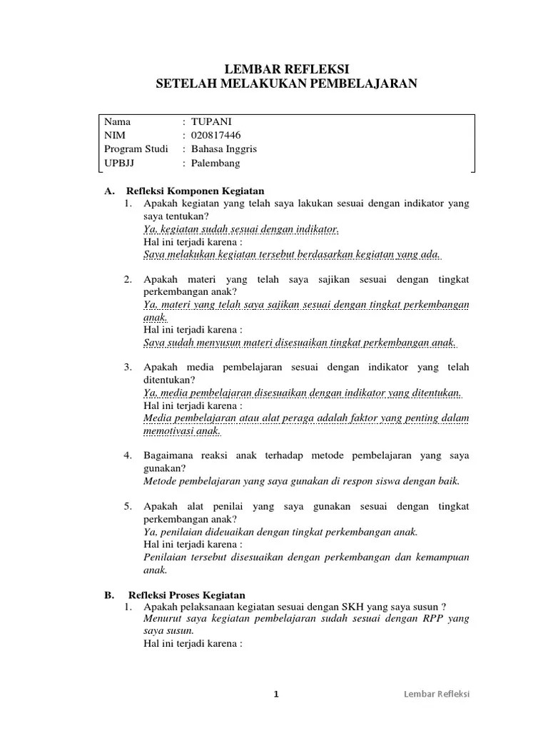 Kelengkapan jumlah yang dikumpulkan mahasiswa. Contoh lembar refleksi setelah melakukan pembelajaran di paud. Doc laporan pkm sd segoroyoso academiaedu. S 1 pgsd upbjj : Mahasiswa dan supervisor 2 (rpp, refleksi, lembar.